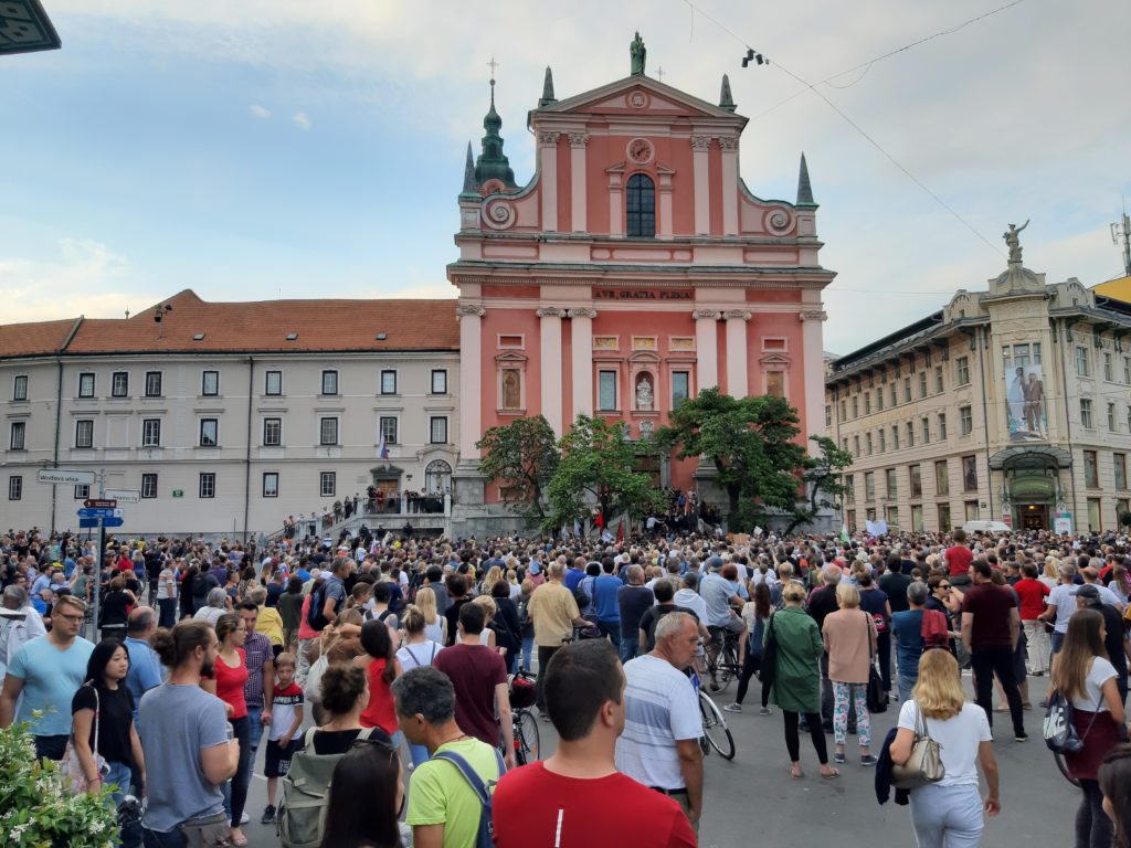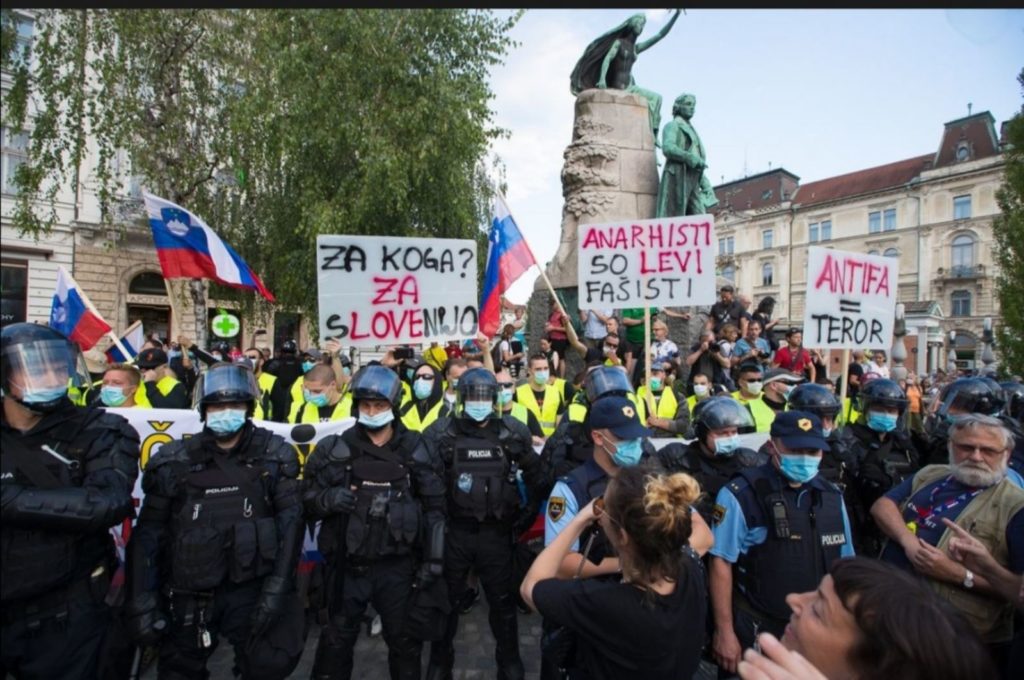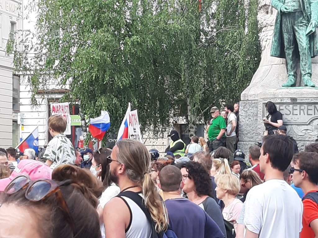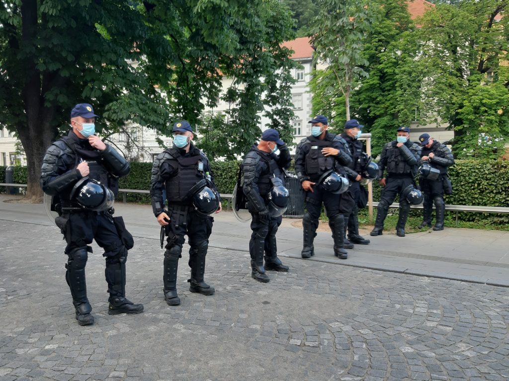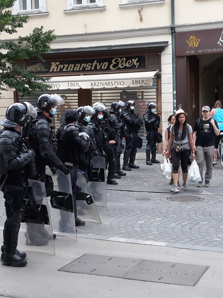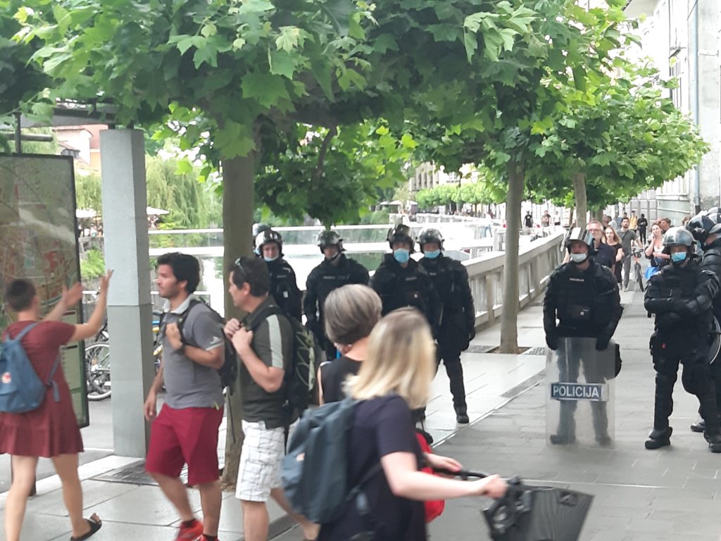 Prešernov trg pa je prepredla tudi specialna enota policije – menda v bran uradni proslavi, ki se je lučaj stran začela ob 21h. Omejevanje gibanja so uvedli že ob 18.30. Komentarji in pritoževanja mimoidočih so se nanašali na nesmiselnost blokad in bizarno ravnanje vlade, s strani policajev pa so prihajala opravičila in potrditev tako bizarne situacije, ko so v popolni bojni opremi z orožjem zavračali mlade družine, da uberejo zamišljen sprehod ob Ljubljanici.