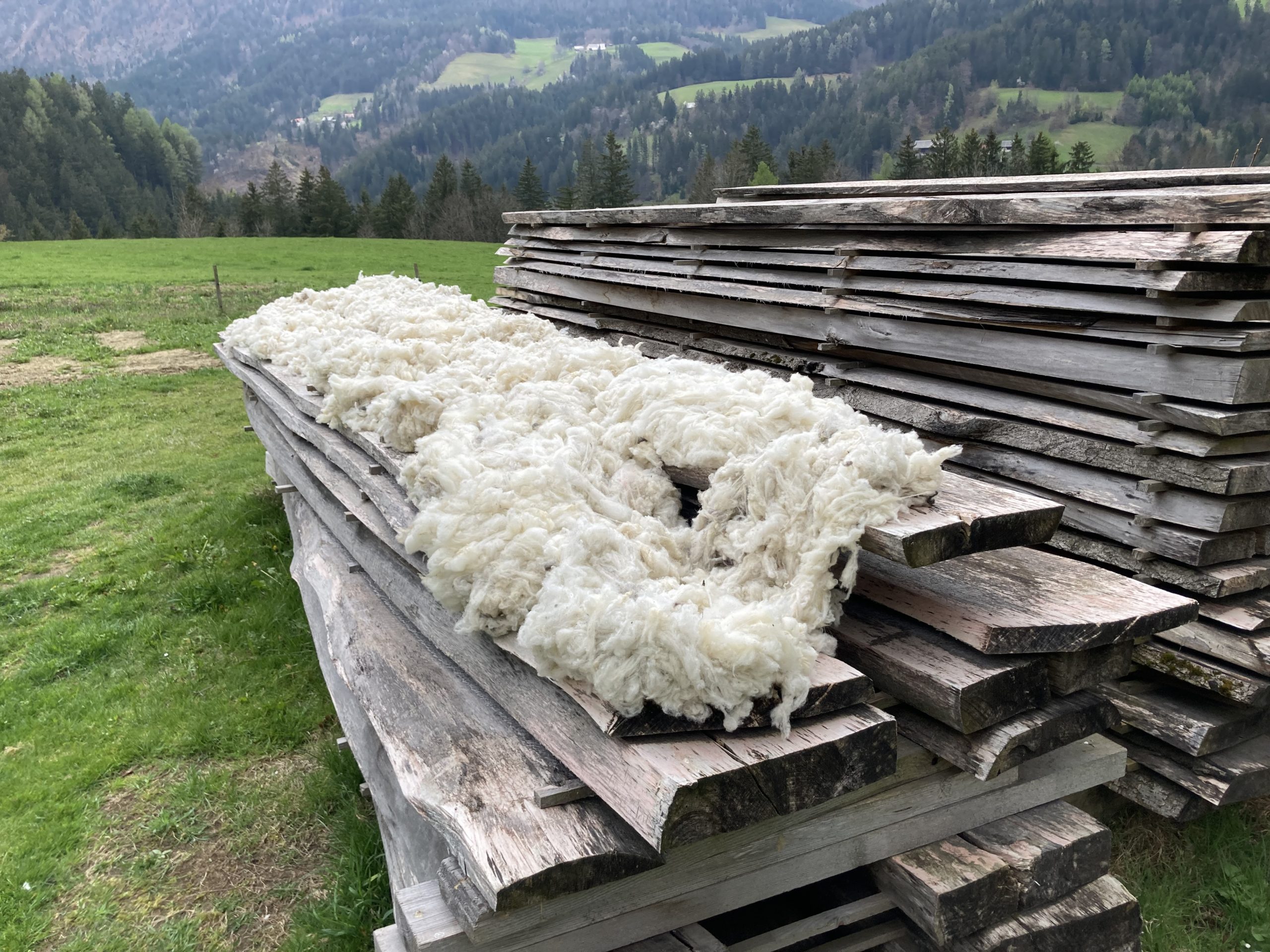 Slika 2: Brez lokalnih predelovalnih obratov breme primarne obdelave znova prevzemajo posameznice, ki volno perejo, sušijo in pripravljajo ročno. (foto: Katarina Šrimpf Vendramin, 24. april 2023).